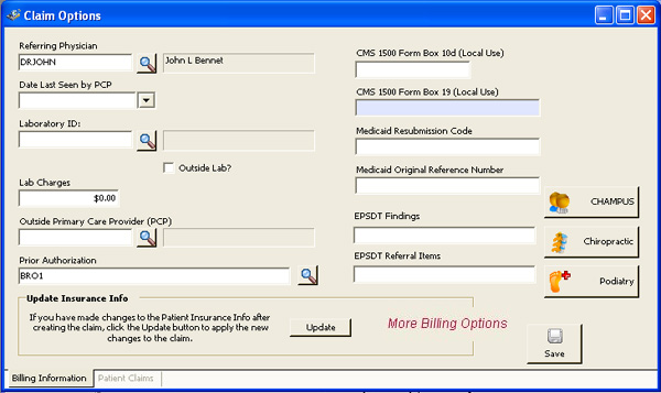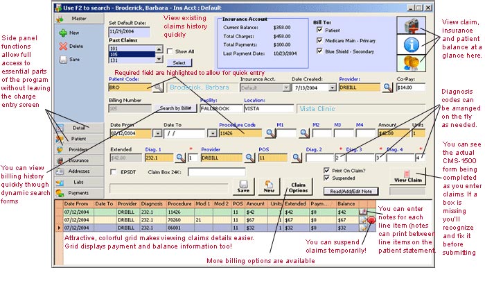 The main window is feature-rich. You can enter new claims, view a patient’s claims history or insurance balance, research prior claims, and see the detail of every transaction on a claim at the bottom of the screen.