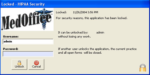 MedOffice will automatically lock if the program is not used for a certain period of time (which you can set). This protection prevents unauthorized use if you leave your desk.